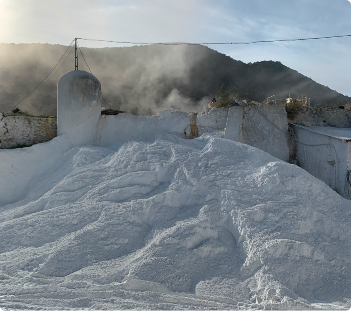 The raw material is calcined in a kiln at 950 to 1200 ºC to obtain calcium oxide (quicklime) and calcium silicates and aluminates. A stoichiometric amount of water is added to this calcined product (exclusively industrial process) to only hydrate the calcium oxide, thus obtaining calcium hydroxide (slaked lime) and silicates (mainly C2S, bi-calcium silicates) and calcium aluminates. The latter, mixed with water in the mortar, react to form hydrated calcium silicates and aluminates, while the slaked lime carbonates, as in an air lime, to form calcium carbonate.